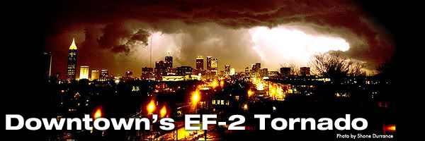 This weekend we had some amazingly insane weather hit the area. Fortunately we weren't hit, but it literally went about 3 miles south of us. Seth was at a birthday party and I didn't really think much about it since we didn't have it bad by us, but he told me stories later of golfball size hail, horrible wind, tornado sirens and power outages. It was a scarey realization to know my son was at Chuck E Cheese that was in the midst of the storm and I wasn't there with him. So scarey! In the last 3 weeks or so, we've had at least 4 MAJOR storms come through here, knocking down trees, cutting out power and causing serious damage. While we need the rain and it's always welcomed, the wind and tornados can stay away. Here are a couple pictures of the tornadoes that hit downtown Atlanta. The CNN tower, Omni Hotel, Westin and many buildings were hit. Centennail Park (where the Olympics were held) is a 'war zone'. Many roads are closed and a lot of buildings are probably going to have to be torn down. They say that the tornado cut a path of destruction 6 miles long!!!! While it was scarey for all of us, the stories of survival and these pictures are truly amazing.